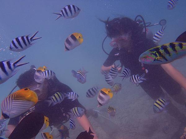 到了海邊,教練們一一幫我們穿上裝備,再教我們呼吸、減壓等等,就帶著我們下潛嘍,最深潛到10公尺的地方,看到魚在身邊游來游去真的好開心。