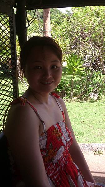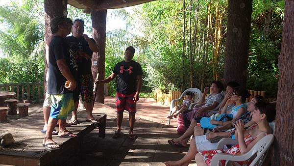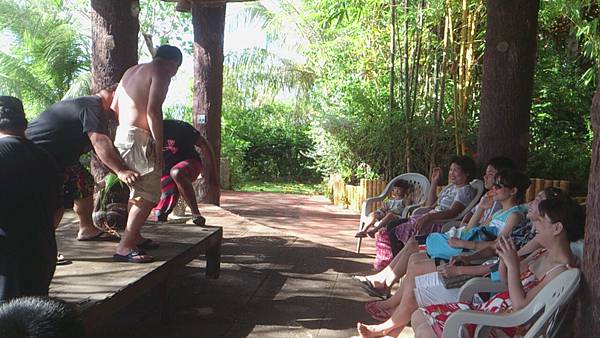 幾個原住民唱唱跳跳的表演開椰子,中間穿插了些亞洲語言增加幽默的情趣,讓我們看得很高興。