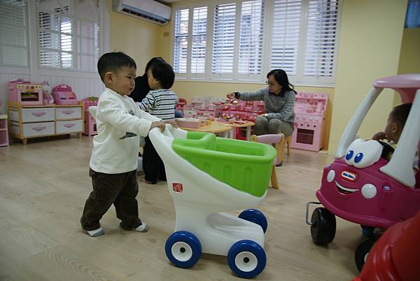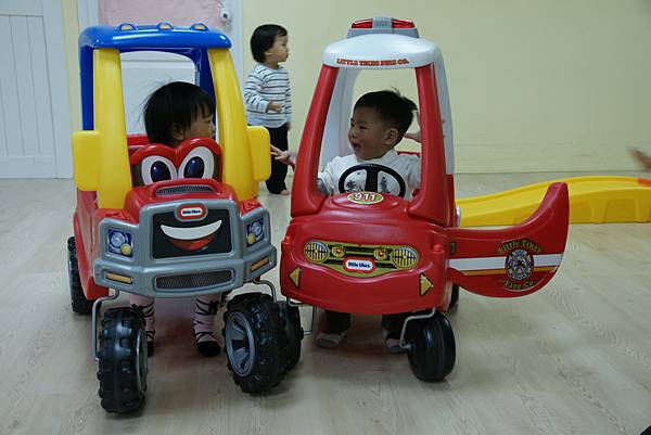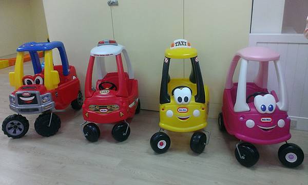 一進來就看到四台車停在旁邊排好等小人們來玩樂。