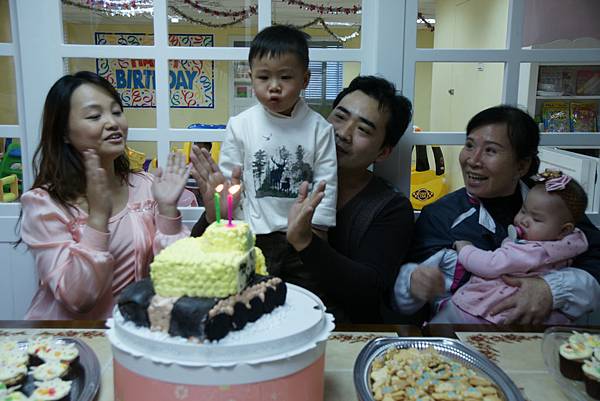 蛋糕餅乾是和Pinoli Cafe訂製的,看到挖土機蛋糕,安格斯眼睛都直了。因為有用小太陽送的蛋糕玩具組練習過,安格斯會吹蠟燭也會切蛋糕。