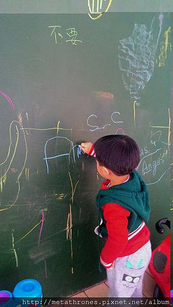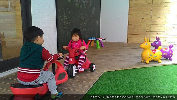 有兩台小車、兩隻跳跳馬、小玩具、還有大大的黑板,