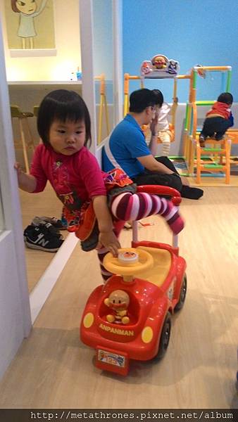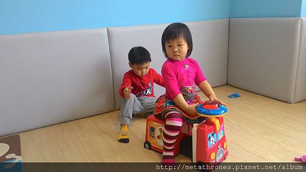 MICKEY的小車,YOMI坐在車上開開,安格斯跟在旁邊玩車子週邊的小東西,有積木、各種按鈕等。
