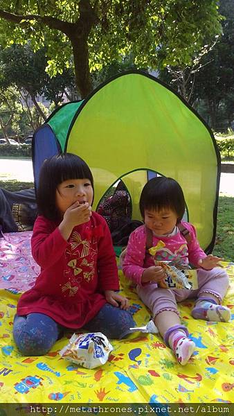 到中強公園鋪上野餐墊,兩姊妹就吃起來了
