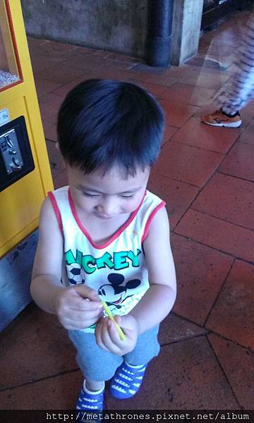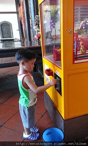 安格斯注意到旁邊的抽籤機,硬是跟我盧很久要10元去投幣,我沒有十元硬幣,就拿了零錢讓安格斯自己去換硬幣,在此之前,我沒有意識到這是抽籤用的機器,直到換幣的時候,廟工問安格斯說:你要去抽籤嗎?