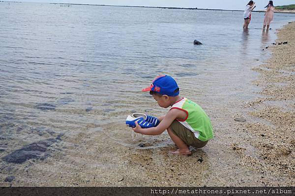 安格斯到了海邊迫不急待的開始玩沙玩水,這裡的沙灘並不是真的細沙灘,大概有大半都是小石頭,我們也沒帶到玩水玩具,安格斯就拿著自己的鞋開始玩…