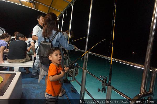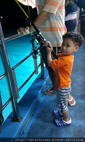 讓安格斯小睡40分鐘把他叫起來,也去體驗釣小管,安格斯很認真的拉著釣竿,還把頭探出海面上喊:魚~你們想吃嗎??快來吃啊!