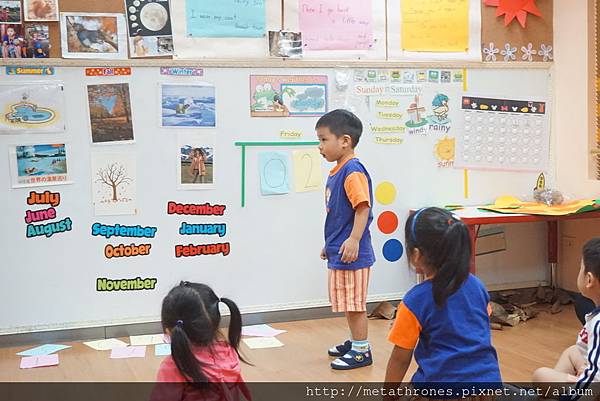說到FALL,Tr. Marco請安格斯上去把September, October, & November貼上去,只看安格斯在前面待了頗久,三個字猶豫著排練組合,最後完美的以三個月份的順序把字排好。