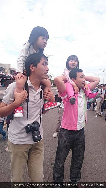 真正的停車位也都滿了,車子都是往大片草地上停上去,下了車,我們直衝接駁車的地方排隊,當時雷虎小組已經開始表演了,大家邊排隊,邊看著天空上的演出,