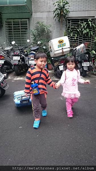 吃完午餐,安格斯自己換好了衣服,然後又幫妹妹穿衣服,自己套上水壺,拉上行李箱,牽著妹妹,準備出門了。