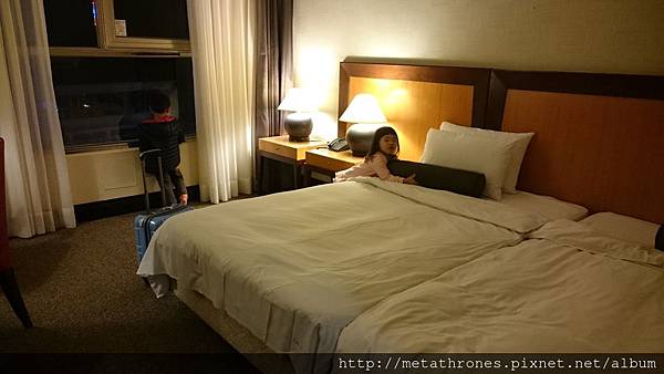 房間並不大,我請飯店幫忙把兩小床合併靠牆,床超大的啊~!!!
