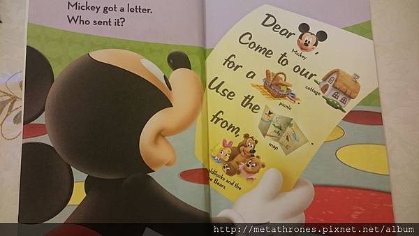 書的第一頁是米奇收到了一封邀請函,要使用地圖和指示來找道路抵達朋友家野餐,