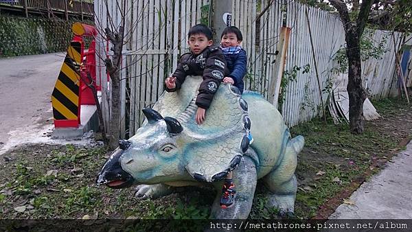 孩子們看到門口的恐龍,很興奮的爬上去拍照,