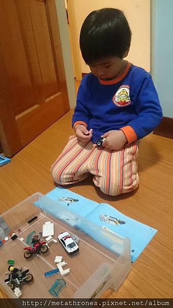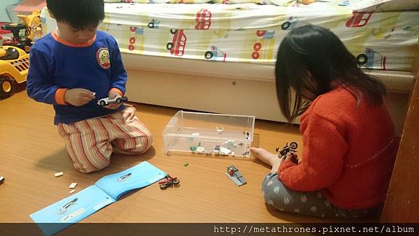 哥哥在做警察車,妹妹在玩已經做好的摩托車