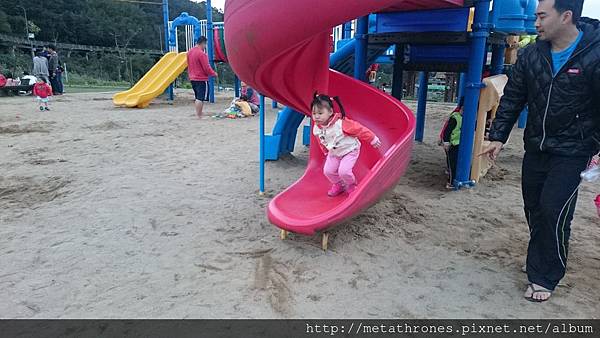 這裡的溜滑梯下方也可以玩沙,準備回家前還得讓他們有時間溜溜滑梯,他們才願意回家>"<