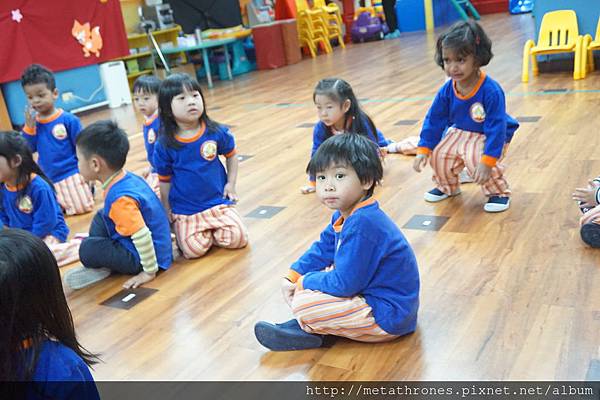 三首熱身的律動結束,孩子們席地而坐,由各班開始表演